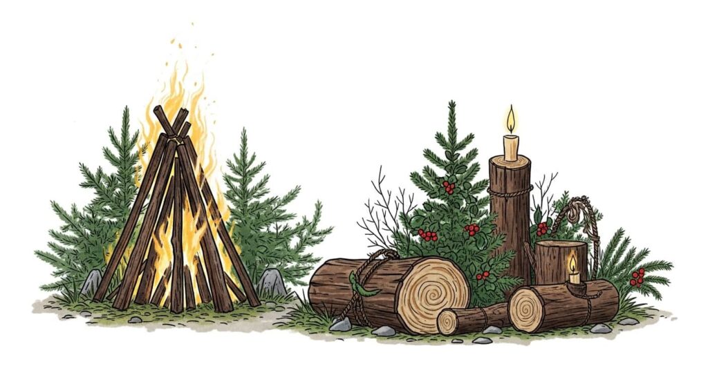 As velas e outras formas de iluminação, onipresentes na decoração natalina, são herdeiras diretas das fogueiras e tochas acesas durante os festivais do solstício de inverno, como a Saturnália e o Yule. Esses rituais buscavam celebrar o retorno da luz e afastar os espíritos da escuridão.